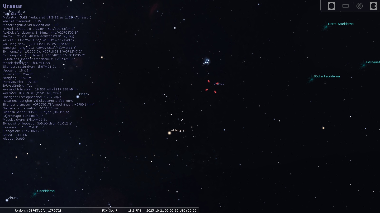 För att se planeten Uranus lättast behöver du en kikare av något slag, även om Uranus ska synas med blotta ögat. Bäst förhållanden för att se Uranus råder när månen inte stör med sitt sken, och månen blir ny 21 oktober. Vid midnatt återfinner du då Uranus ganska högt över horisonten i sydost, snett till höger ovanför den ljusstarka stjärnan Aldebaran och en liten bit under den mytomspunna stjärnhopen Plejaderna i Oxens stjärnbild.